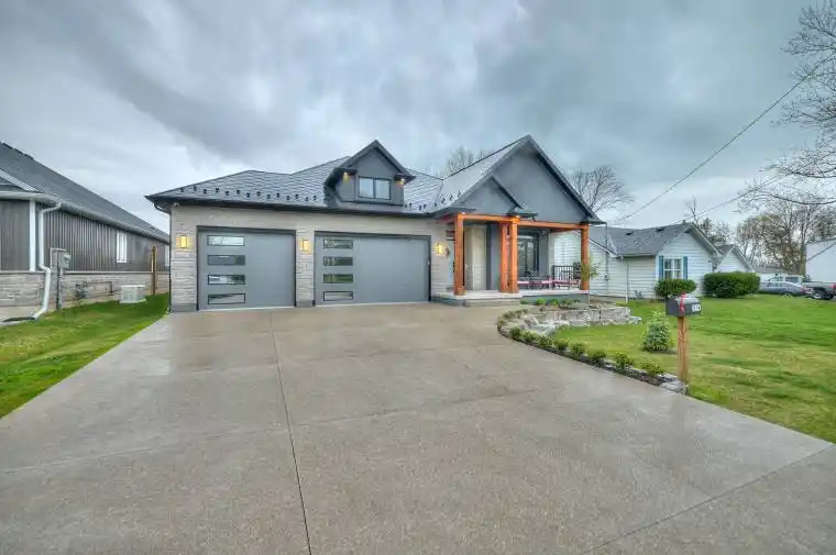 Amazing home in Excellent location near the QEW, Shopping and US border. 3 + 2 bedroom Bungalow finished top to bottom. This home has MANY upgrades you will not find in homes at this price point. Lifetime diamond shape metal roof, ICF foundation, 3 car insulated garage, separate walk out to basement, huge covered rear deck. 9 ft ceilings on main floor, 10 ft tray ceilings in LR & DR. 9 ft basement height. Engineered hardwood throughout main level. 46 inch linear gas fireplace, Quartz Double waterfall edge on oversized kitchen island, glass wine display, 12 ft double sliding patio door to covered porch. 4 zone sound system, 7 camera security system, fully finished basement with 2 additional bedrooms, 5 piece bath and huge rec room w/ gas fireplace. Primary ensuite and basement bathroom have heated flooring. Outdoor wooden Sauna is included. 4 years remaining on Tarion warranty. Quartz countertops in all bathrooms. Newly finished concrete/aggregate driveway. Beautiful home, you will NOT find another like this one. **Listing agent is related to sellers. Purchase price shall include a 10.01 m x 12.19 m parcel at the rear of property. Swim Spa is negotiable.