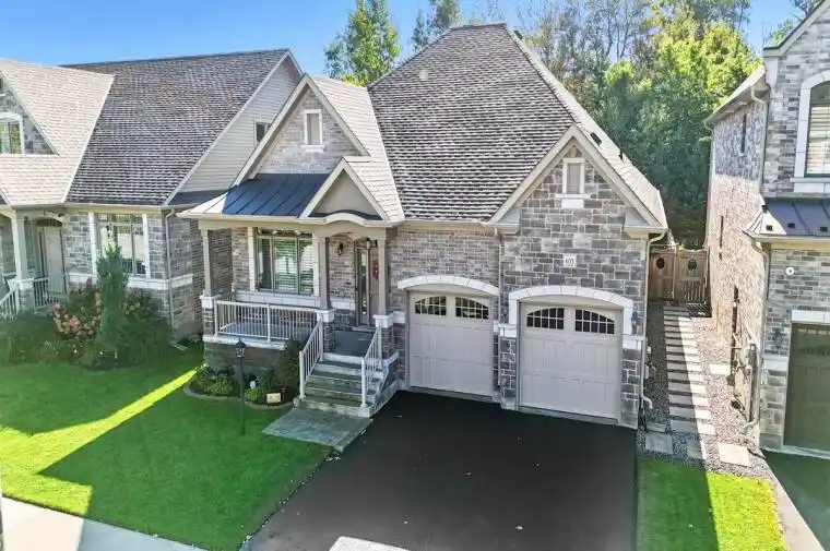 Holland Homes Custom luxury bungalow backing onto environmentally protected land. Wrapped in tumbled stone and brick with a dramatic high-pitched roofline, this rare offering delivers privacy, permanence, and peace. Over 90 builder upgrades in this Charnwood 50 model elevate every detail. You must see the pictures! Open-concept main level is finished in engineered hardwood, oversized baseboards, anchored by a great room with 9 foot coffered “waffle” ceilings, and a chef’s kitchen with a statement island overlooking the fireplace. A sun-filled breakfast area walks out to a covered deck and fenced yard… no rear neighbours, no future development, just birds, trees, and sky. The primary retreat features a spa-inspired ensuite with heated floors, freestanding soaking tub and separate glass shower. A second bedroom enjoys its own private ensuite, ideal for guests or home office flexibility. Main-floor laundry allows true one-level living The finished lower level adds a half-bathroom and an oversized media lounge perfect for movie nights, games, or visiting family. The unfinished area offers storage and opportunity to add your own custom rooms Quietly positioned on the east end of George Reynolds Drive, this low-traffic setting offers a country feel while being surrounded by green space. This is downsizing and upgrading at the same time!