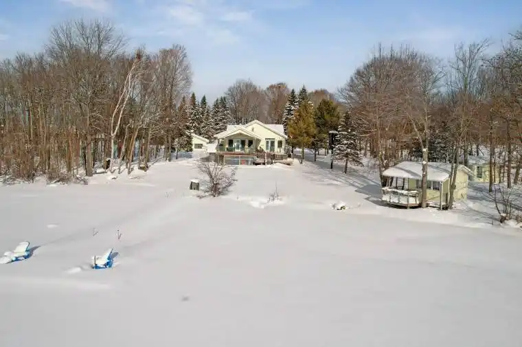 Exceptional point offering on the tranquil shores of Little Lake, custom-built year-round waterfront home is perfectly positioned on a quiet municipal road with expansive southwest exposure & unforgettable sunsets. Set on a level 0.81 acres with 218 ft of private shoreline, offers direct access to the Trent-Severn Waterway, connecting through Gloucester Pool to Georgian Bay opening the door to endless boating, fishing, and cruising. Offering 3,500 sqft with 4 bdrms, 3 baths, a gourmet kitchen and a lower-level kitchenette, along with two laundry areas, providing excellent flexibility for family living, entertaining, or extended-stay guests or multi-generational living. The main level is designed to maximize lake views and everyday comfort, offering an inviting open-concept layout flooded with natural light from oversized windows throughout. The living space flows seamlessly between cozy gathering areas with fireplaces, a sitting room, and a dedicated dining area – ideal for both entertaining and relaxed evenings by the fire. Anchoring the level is a custom gourmet kitchen, recently renovated and appointed with granite countertops, premium appliances, and abundant cabinetry. A serene primary suite with ensuite. Multiple walk outs extend the living space to a wrap-around covered porch, providing shaded outdoor enjoyment and exceptional waterfront views. The fully finished lower level is exceptionally well laid out, featuring a roomy kitchenette with dining area, a large recreation and family room, dedicated office space, generous bedrooms, a full walk-up separate entrance. Outdoors, enjoy a private dock, a peaceful bunkie with its own deck for additional sleeping space, and a spacious triple heat garage ideal for vehicles, workshop , or seasonal storage. Conveniently located minutes to marinas, LCBO, general store, Rawley Resort and Inn at Christie’s Mill, with nearby skiing and golf & snowmobiling . Approx 35 minutes to Barrie with easy access to Highway 400.