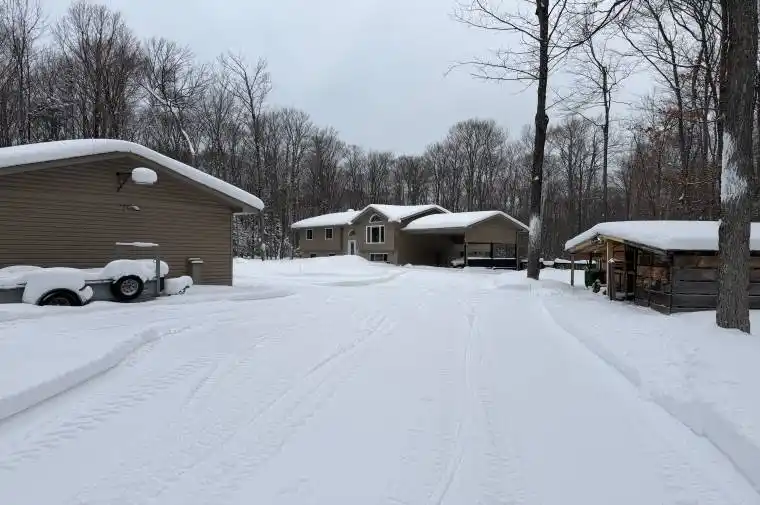 This property offers a blend of rural tranquility and nature. This custom five-bedroom, two-bathroom residence is situated in a picturesque country setting on 2.48 acres in the Powassan area. The heart of the home is the bright, open-concept kitchen, featuring a spacious granite island that seamlessly combines functionality with style, ideal for culinary creations. The spacious living room with large windows, wood and beam cathedral ceilings, built-in bench seating and floor-to-ceiling custom cupboards, along with a 4-season sunroom, thus providing ample space for family. The primary suite is a private oasis, complete with a large walk-in closet with laundry hookup, back deck access, and a cheater ensuite with dual sinks. A beautifully finished lower-level family room adds to the living space. The windows throughout this home provide an abundant amount of natural light. Outdoors, the property continues to impress with an expansive back deck featuring a custom live edge bar for entertaining with a scenic view of nature. Designer landscaped yard with garden boxes, established flower beds, edged with large rock boulders and a custom circular fire pit. An attached carport capable of holding two full-sized vehicles. Granite stone circular driveway provides extensive parking.The property also features a spacious detached 26×36-foot heated shop with running water. This property includes central air conditioning, wood or propane forced air heating systems, backup generator capabilities, updated shingles, eaves with leaf guards, direct propane hookup to kitchen and the back deck. Powassan has education, health care, library services, recreation and enjoyment. Main Street showcases a classic, welcoming Northern Ontario town with local shops, services and a friendly community atmosphere, hosting an annual Maple Syrup Festival in the spring, celebrating its heritage and regional specialty. Located 30 kilometres south of North Bay.