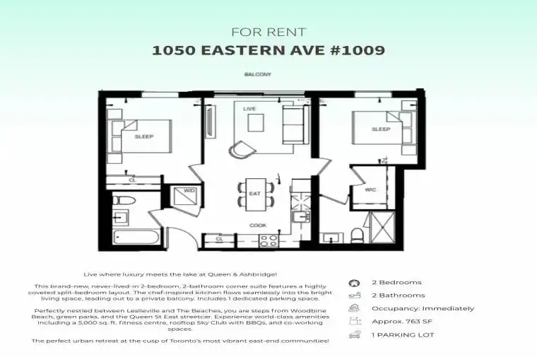 Experience the perfect blend of style and function in this brand-new 2-bed, 2-bath residence at QA Condos. The desirable split-layout ensures no wasted space and extra privacy for both bedrooms. This suite features a modern kitchen, spa-like bathrooms, and includes 1 dedicated parking space. Residents have access to top-tier amenities: a massive fitness centre with yoga/spin studios, sauna, rooftop lounge with BBQs, and co-working spaces. Perfectly situated between Leslieville and the Beaches, offering easy access to parks, the waterfront, and the Queen St East streetcar. A rare opportunity to be the first to live in this stunning suite.