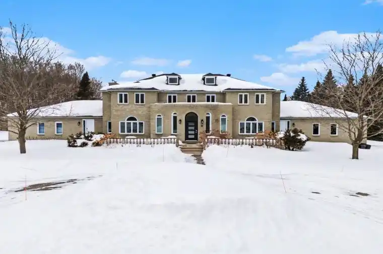 Welcome to your private estate in the heart of Rideau Forest, set on approximately 2 acres surrounded by mature trees and manicured grounds. Offering over 5,500 sq ft above grade, this impressive all brick two story home features 5 bedrooms and 7 bathrooms, with every bedroom complete with its own ensuite. A grand vaulted foyer sets the tone, leading into expansive principal rooms designed for both everyday living and large scale entertaining. The formal dining room comfortably accommodates twenty guests, while the kitchen and breakfast area overlook the rear gardens and inground Gunite pool, creating a seamless indoor outdoor connection. The main level includes multiple living spaces, a den or optional bedroom, and elegant finishes throughout including hardwood flooring and crown moulding. Upstairs, the primary suite is a retreat of its own, featuring a marble appointed 5 piece ensuite, generous walk in closet, and a private sitting area framed by oversized windows. The fully finished lower level adds exceptional versatility with a sprawling recreation room, media space, full bath, additional bedroom, and direct access from the garage, ideal for extended family or guests. Car enthusiasts and collectors will appreciate the rare dual triple car garages with inside entry, offering parking for six vehicles. Major updates include roof, windows and exterior doors replaced in 2018, along with two high efficiency furnaces, two A/C units, and two hot water tanks. Outdoors, enjoy a 36′ x 17′ inground pool enclosed by elegant wrought iron fencing, expansive interlock, and lush lawns that offer both privacy and presence. A distinguished residence in one of the city’s most sought after estate communities.