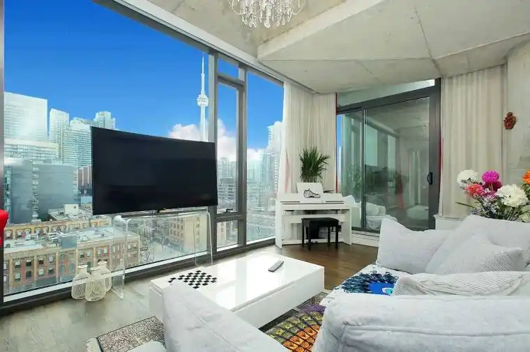 Experience luxury living in this fully furnished 2-bedroom sub-penthouse corner suite at Fashion House, located in vibrant King St West. Enjoy breathtaking south-facing views of the CN Tower &Toronto’s skyline from every window, W/direct views of the rooftop pool right in front of your spacious balcony. This bright & airy unit features an open-concept, split-layout design for privacy& comfort W/Floor-to-ceiling windows throughout, including the primary bedroom. The modern kitchen offers sleek stone countertops, stainless steel appliances, & a chic marble backsplash, while the recently renovated ensuite boasts all-marble finishes. Additional highlights include hardwood floors, exposed concrete ceilings, and a gas line for BBQs on the balcony, which includes an enclosed area for added versatility. Situated in one of Toronto’s top neighborhoods with a 98 walk score, you’re just steps from trendy restaurants, nightlife, and entertainment. This is urban living at its finest!