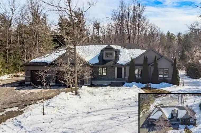 Welcome to this stunning country property, a true gem built in 2011, nestled on a spacious 1.23 acre lot measuring 195′ x 275′. This beautiful 2110 sf (per blueprint) bungalow boasts a charming stone and vinyl exterior, complemented by an attached heated four-car garage (1-double overhead door and 2 single overhead doors) and lots of parking for 10+ vehicles. Conveniently, the main floor offers direct access to the garage, while a secondary entrance leads to the basement from the garage, enhancing the home’s functionality. At the heart of this property is a picturesque spring-fed pond located in the rear yard, approximately 10′ deep, perfect for those seeking tranquility and natural beauty. The back yard features a wooden deck off the kitchen within a chain-link enclosure, providing a safe children’s play area with playhouse and swing. Inside, the main level showcases an open-concept design that seamlessly connects the kitchen, great room, and separate dining area. The kitchen features rich dark cabinetry with granite countertops, stainless steel appliances, ceramic backsplash and separate desk area. The ceramic tile flooring adds durability, while a corner pantry with shelving and a convenient two-piece powder room enhance practicality. The kitchen also opens up to a deck that overlooks the pond and is surrounded by mature trees, creating a country outdoor retreat. The great room is highlighted by a large picture window, vaulted ceiling and pot lights with hardwood flooring. Double entry doors lead to the spacious primary bedroom, which includes a walk-in closet and a 5-piece ensuite complete with soaking tub, separate shower and 2 sink vanity. Two additional front bedrooms and a well-appointed 4-piece main bathroom complete the main floor.