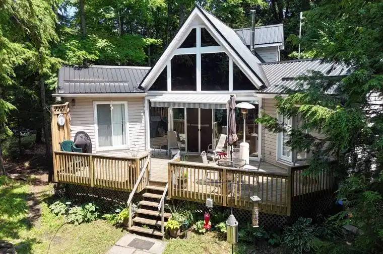 Welcome to Limerick Lake! This impressive chain of five waterways offers clean, clear water, miles and miles of boating, sailing and great fishing. This gorgeous, chalet style cottage is situated in a private spot on a mostly level lot with 100 feet of clean, rocky, west facing shoreline where you’ll tie your boat and tan on the series of U-shaped docks. Many fine features include a vaulted, tongue & groove ceiling, large, west facing windows, a bright, beautiful kitchen with lots of cupboards and counters and a breakfast bar, great for entertaining. The dining area looks out to the great 35X16 foot deck, and the spacious living room has a cozy wood stove. There are two main floor bedrooms, with doors to the deck, main floor bathroom and a main floor laundry off the back porch. Up the attractive, curved staircase you’ll find an 18X20 foot loft sleeping area with built-in dressers and two queen beds! Many other features include, pine floors throughout, steel roof, vinyl siding, and 4 storage sheds. A heat pump provides heating and cooling, UV water system and comes turn-key with all appliances, furniture, a fully equipped kitchen, beds & bedding and more. Access to this cottage is just a 10-15 minute boat ride from the full service marina with docking, parking , gas and supplies. The marina is 30 minutes from Bancroft and 45 minutes from the 401 at Belleville.