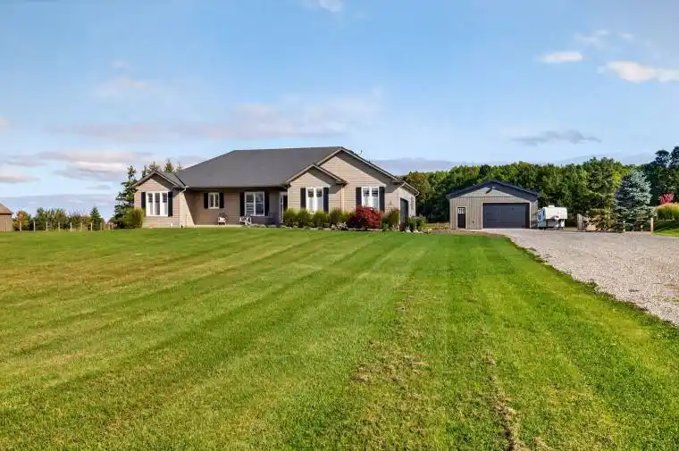 Experience the perfect blend of luxury and comfort in this stunning 1,902 sq. ft. bungalow set on 2.09 beautifully landscaped acres. Fully renovated main level and truly move-in ready. This 3 bedroom, 2 bath home is designed to impress. Step inside to find Luxury Vinyl Plank flooring throughout, freshly painted interiors, and a gorgeous modern kitchen with a breakfast bar, idealfor morning coffee or casual entertaining. The spacious great room boasts soaring cathedral ceilings, custom fireplace, and built-in shelving, creating the perfect gathering space for family and friends. The 1,853sq ft partially finished basement offers endless potential. Outdoors, you’ll fall in love with the in-ground pool with nothing but open space, offering the ultimate private oasis. The backyard deck features both a cozy covered seating area along with a covered culinary space, perfect for summer barbecues and evening entertaining. For hobbyists or those with a love for mechanics, the separate serviced shop (with both water and hydro) provides ample room for projects, storage, or toys. This property truly has something for everyone inside and out.