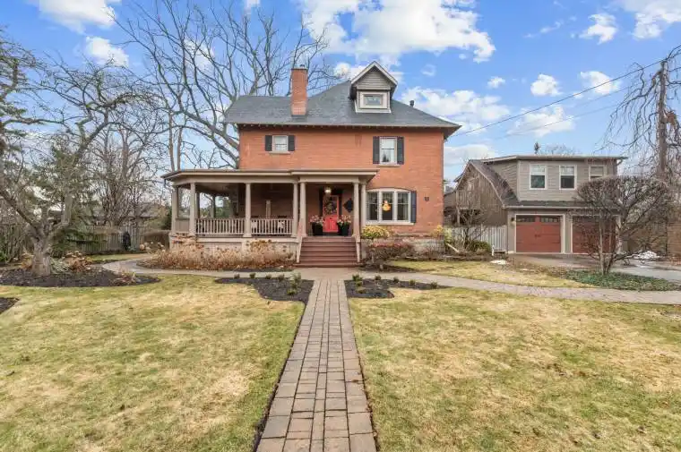 Create your very own Downton Abbey and experience the perfect blend of historic charm and contemporary elegance. This remarkable residence showcases timeless character alongside modern finishings, inviting you to live your best life surrounded by beauty and sophistication.From the moment you enter, soaring grand ceilings on both the main and second floors set the tone for the home’s stately presence. Original hardwood floors span the first two levels, preserving the rich charm of yesteryear, while tasteful decor and oversized rooms create an atmosphere of refined comfort.The beautifully appointed kitchen features travertine flooring, an inviting eat-in area, and a walkout to the backyard oasis. Enjoy quiet mornings or evening gatherings on the cozy wraparound porch with pot lights, or in the enclosed sunroom overlooking lush, English-inspired gardens and a tranquil babbling brook pond.Upstairs, each spacious bedroom offers walk-in closets and grand ceilings, while the large laundry room-with its own walkout to a deck-makes chores a pleasure. The deck connects to a private gym and 3-piece bath located above the heated garage.The third floor is your private master retreat-a true sanctuary featuring a wraparound walk-in closet with custom built-ins, corner gas fireplace, and a stunning en-suite. Relax in the claw-foot tub or steamer shower, warmed by the gentle glow of a Napoleon electric fireplace. The large heated loft garage includes hydro, a garage door openers with remotes, and access from both the backyard and laundry room.Outdoors, the property is an absolute haven. Set on a rare double lot, the backyard offers mature perennial gardens, two ponds, a serene fire pit area, and a new fence providing privacy and peace. Enjoy natural gas hookups for your BBQ and future outdoor fireplace-perfect for entertaining in every season. New Fencing installed Fall 2024. Survey on File 2023. Walking distance to Trafalgar Castle (Private School) and Henry St High.